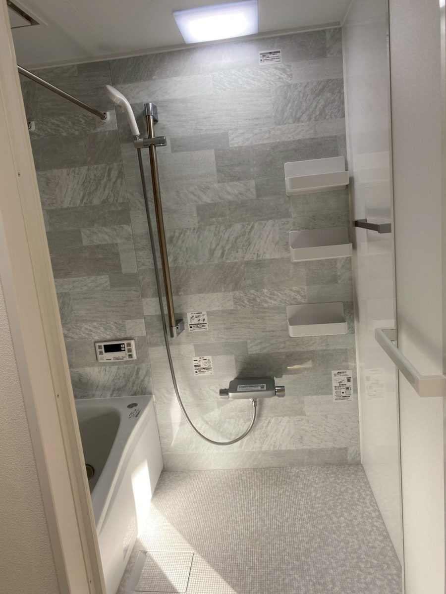 浴室はあえて鏡を設けず、大理石調パネルの美しさが際立つシンプルな仕様に。