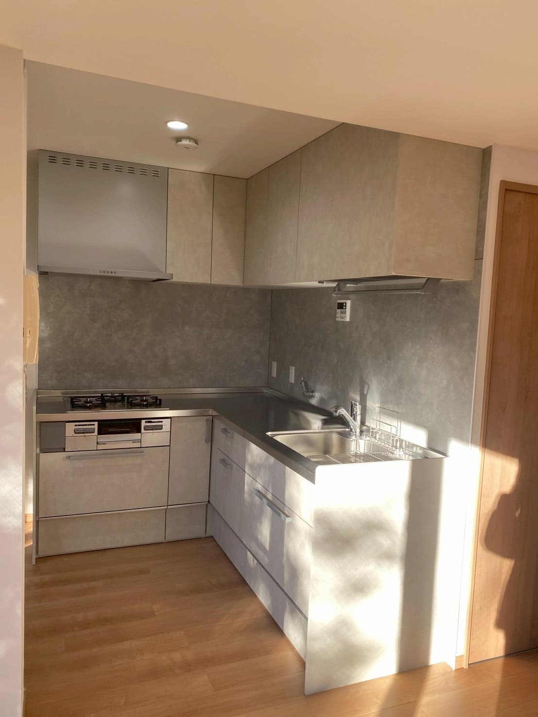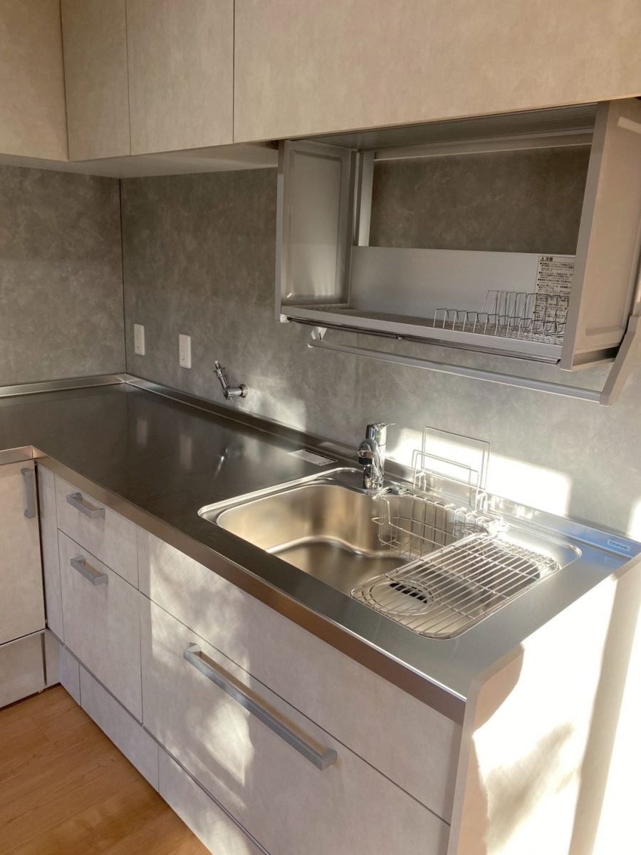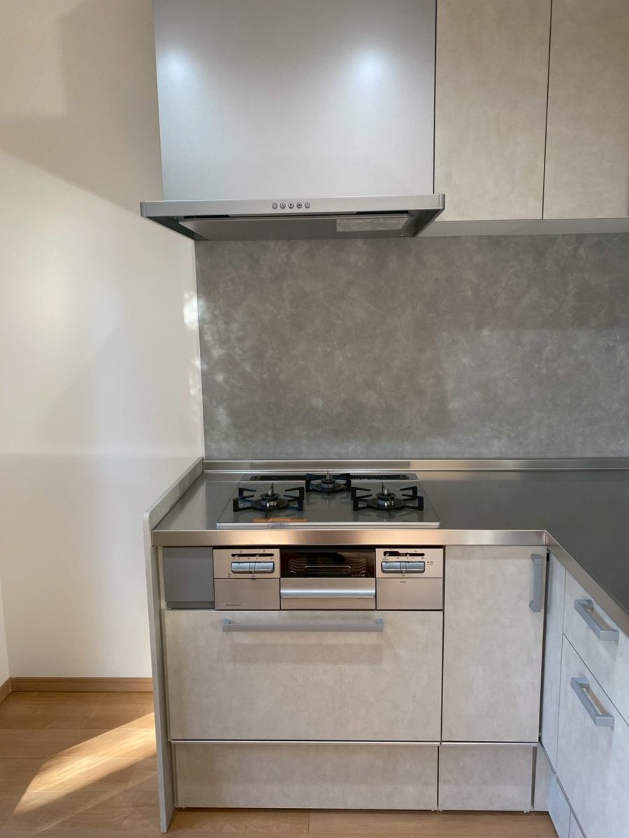コンクリート調グレーで統一したパネルとキャビネットが空間を引き締め、ステンレス天板が清潔感をプラス。